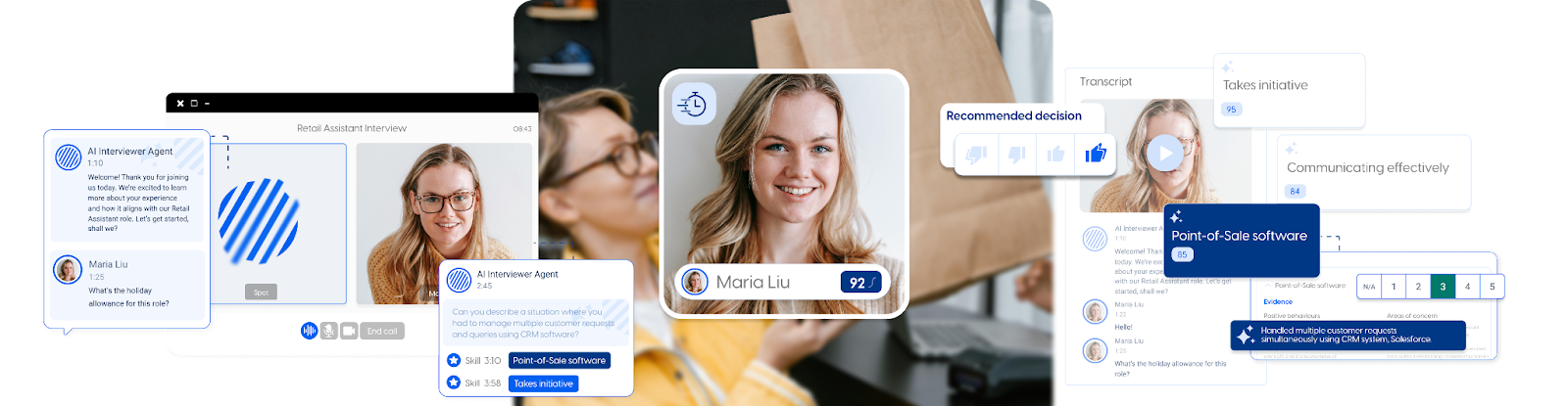 Powered by Spot, our AI assistant, AI Interview Agent conducts live, adaptive, two-way screening conversations with every candidate - on any device, at any time, in their own time. Not a chatbot. Not a one-way video. A genuine conversation that probes dynamically based on what the candidate actually says, evaluating against the skills that predict success in the specific role.
